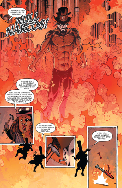 « Null Narcos est un artiste populaire du FREAK-CHIC CIRCUS SIDESHOW, capable d’endurer sans douleur d’horribles violences sur son corps. Mais en dehors de ses spectacles nocturnes, Null est une coquille vide ayant tout oublié de son passé… Lorsque d’autres artistes du cirque commencent à mourir mystérieusement, Null commence à se souvenir de sa vie d’avant… une vie de meurtres, de terreur, et d’ailes noires. »